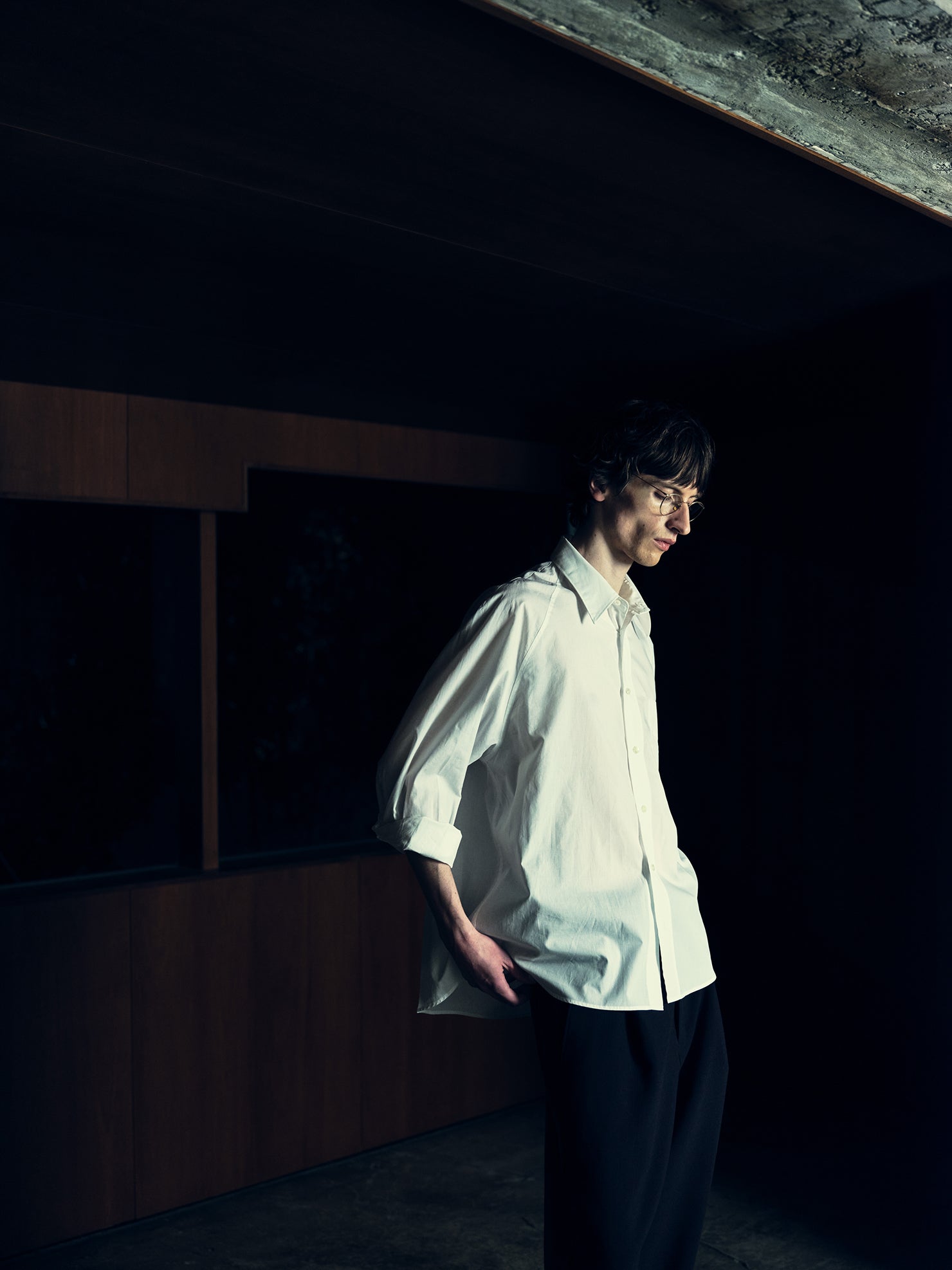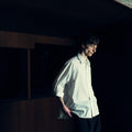 正面から見るとラグランスリーブに見える、不思議な袖付けのパターンワークを施したシャツ。